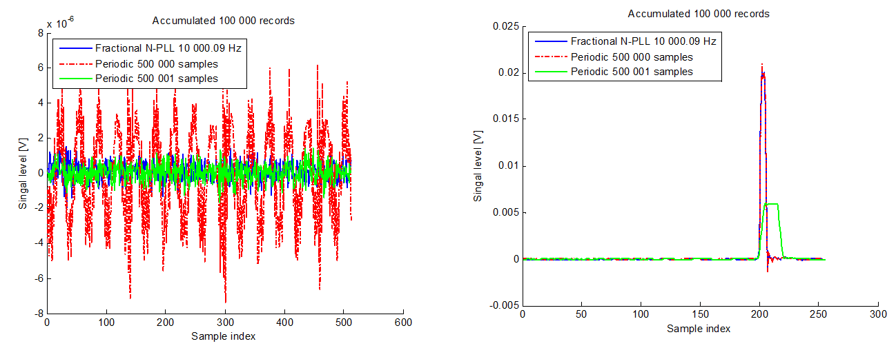 However, when a large number of records are accumulated, systematic noise may become apparent. Refer to the figure below, where the left-hand red curve illustrates accumulated systematic noise at 6 µV. This type of noise is amplified when the trigger is correlated with the noise source.