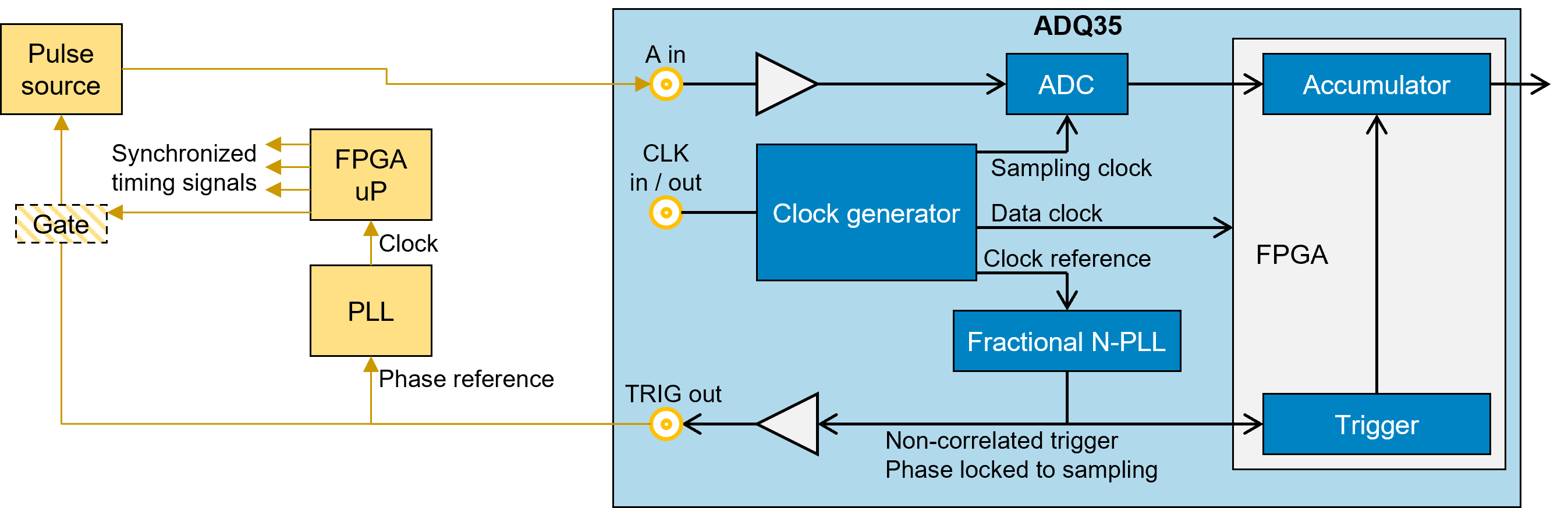 The method relies on a Fractional-N PLL, which requires the ADQ35 to act as the timing master within the system. This may necessitate some system-level redesign. For scenarios where only the pulse source needs to be triggered, figure 7 in the application note provides a viable solution. If more precisely controlled signals are required, this approach remains applicable but with minor modifications.